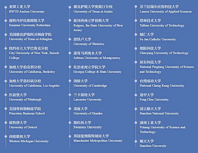 从 1981 年建立管理科学系开始,皇冠博彩公司 就陆续与德国、英国、美国、加拿大、日本、澳 大利亚、比利时、新西兰、保加利亚、泰国、 孟加拉、韩国等国家以及台湾地区的多所院校建立了友好合作关系。院利用广泛的校际合作关系和国际优质教育资源,与海外院校深入开展联合学位、学期交换、短期研修课程、短期实习、参加国际会议和文化交流等多种交流形式,为学生创造丰富的海外学习交流机会。我院各层次学生,包括本科、硕士、博士研究生及MBA 等专业硕士学位项目学生均可根据自身情况申请各类项目。为促进博士研究生的国际交流与合作,开拓博士研究生国际学术视野,培养博士研究生科研创新能力,提高博士研究生培养质量,皇冠博彩公司 设专项经费支持博士研究生出国参加高水平国际会议。