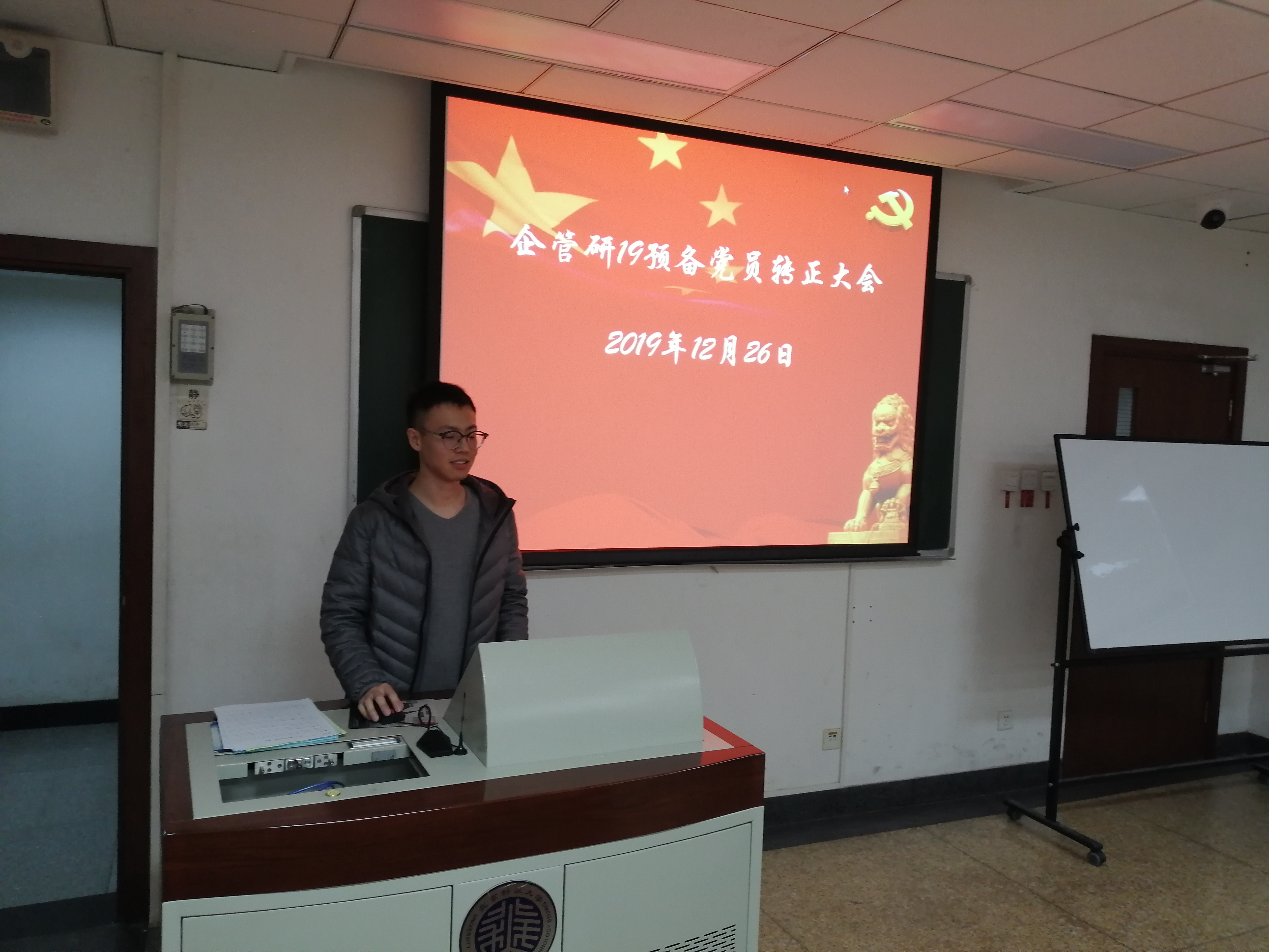 12月26日下午3点30分,企管研19党支部于管楼502教室召开了预备党员转正大会。会议由刘维支持,支部全体成员参加了本次会议,一同对刘晓敏、楚中柱、袁翠和刘迪四名预备党员发展为中共党员进行了讨论和表决。