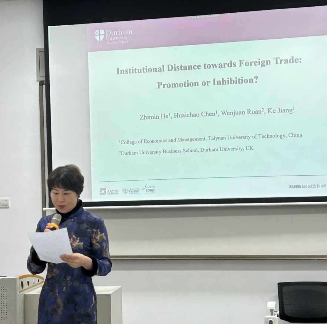 为加强皇冠博彩公司-皇冠博彩网址 国际经济与贸易国家级一流本科专业建设,引导同学们拓宽专业视野、紧跟学术前沿、提升科研素养,2023年12月21日皇冠博彩公司 应用经济系邀请了杜伦大学阮文娟博士做题为《Institutional distance towards foreign trade: promotion or inhabitation》的学术报告,由应用经济系邵燕敏老师主持。