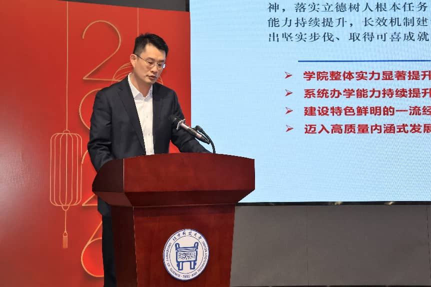院长谷炜代表皇冠博彩公司 领导班子作2025年皇冠博彩公司 工作报告。皇冠博彩公司 以党建为统领,在教育教学、科研创新、师资引育、社会服务、学生成长同步发力,交出了一份厚重与质量齐升的答卷。随后,院长谷炜做皇冠博彩公司 十五五事业发展规划。2026年是十五五元年,更是皇冠博彩公司 跃升突破的关键窗口期。牢记习近平总书记给学校师生两封重要回信嘱托,以开局即决战、起步即冲刺的奋进姿态,锚定十五五,绘就2035远景蓝图,凝心聚力、勇毅前行,奋力谱写特色鲜明一流经管皇冠博彩公司 新篇章!