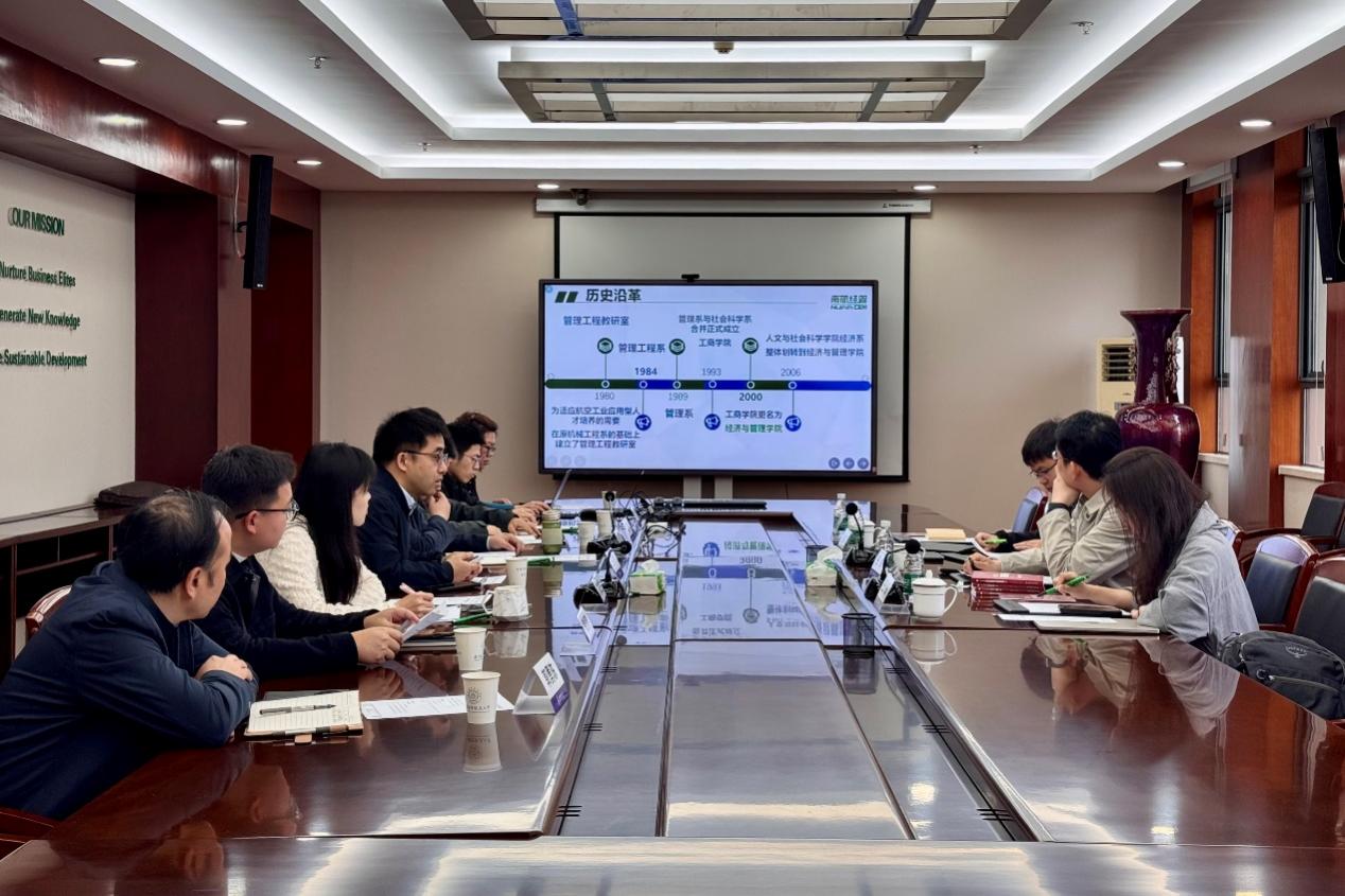 2026年4月22日上午,皇冠博彩公司 院长谷炜一行4人赴南京航空航天大学经济与管理皇冠博彩公司 开展调研。南京航空航天大学经济与管理皇冠博彩公司 院长王群伟,副院长谢乃明、查冬兰、欧阳林寒,管理科学与工程系主任陈剑、副主任黄周春以及实验信息中心主任郭勇陈热情接待。