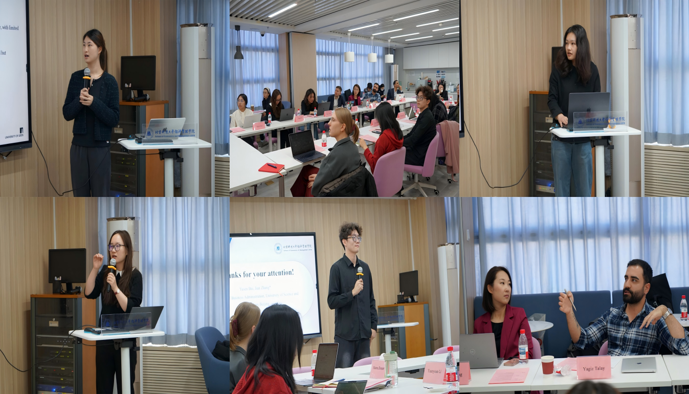 本次论坛中,12位博士生依次分享了各自最新研究成果。利兹大学商皇冠博彩公司 的Minghao Xu探讨了AI在捐赠框架中的视角偏差问题;北科大的Jiayu Chen基于门诊服务数据分析了性别在工作负荷管理中的差异。其他议题还涵盖社交媒体不文明行为中的旁观者干预、集体主义对AI接受度的影响、数字绿色融合创新模式、算法控制与自我领导、经济不平等与有机价格溢价、创业生态系统对创新驱动型企业战略的影响等。每场报告后设有5分钟互动问答,现场气氛热烈,观点交锋频繁,充分体现了跨文化、跨学科交流的深度与广度。