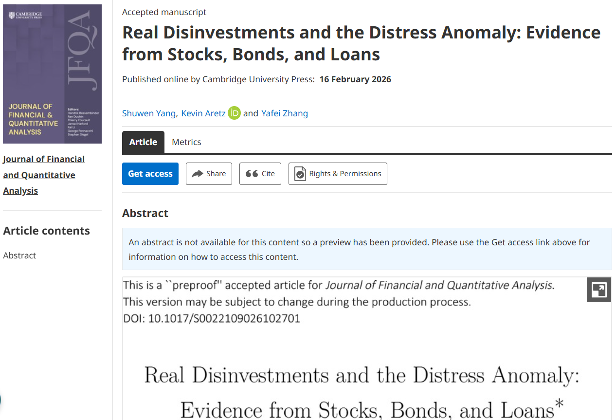 近日,我院金融工程系讲师杨舒文作为论文第一作者,与曼彻斯特大学教授Kevin Aretz和沙迦美国大学助理教授Yafei Zhang合作撰写的学术论文《Real Disinvestments and the Distress Anomaly: Evidence from Stocks, Bonds, and Loans》在FT50列表期刊Journal of Financial and Quantitative Analysis(JFQA)发表。