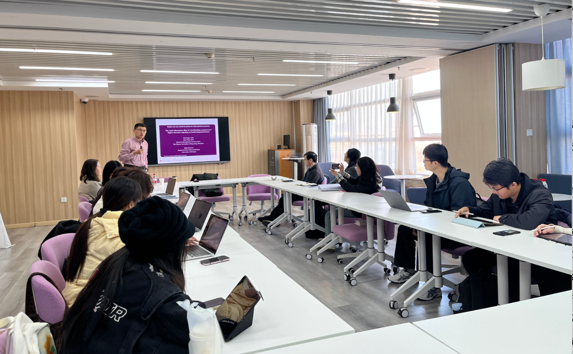 讲座以“When an all-star playing in the minor league: The status dissonance effect of crowdfunding entrepreneurs' educational and professional rhetoric on fundraising performance”为主题展开,重点介绍了在众筹平台Kickstarter上,创业者所展示的教育背景如何通过引发“地位不协调(status dissonance)”,对融资绩效产生消极影响。随后,姜教授进一步分享了另一项关联研究“The impact of BLM social movement on crowdfunding performance of black entrepreneurs”。该研究与第一篇论文基于同一核心数据集,并分别引入不同维度数据进行拓展分析,体现了针对不同研究问题展开深入探索的逻辑脉络。在交流过程中,与会师生围绕理论机制、研究设计、变量测量和众筹平台性质等提出了具体的问题,并与主讲人展开了深入的探讨。讲座现场互动充分,讨论热烈,取得了良好的学术交流效果。