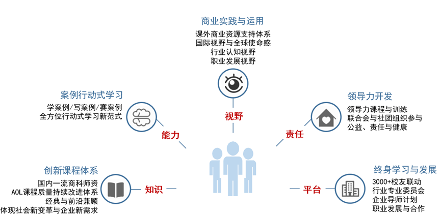 “五位一体”是指从创新课程体系、案例行动式学习、商业实践与运用、领导力开发、终身学习与发展这五个维度,赋予学生“知识”、“能力”、“视野”、“责任”和“平台”五类综合资源,进行全方位的人才培养,实现最优的学习价值塑造。